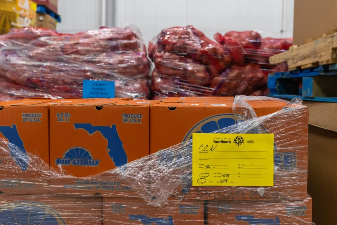 Fresh citrus awaits to be distributed at the Greater Lansing Food Bank (GLFB) in Lansing, Mich., on April 8, 2025. A variety of foods are offered at the GLFB including shelf stable items, fruits, vegetables, and more. Photo by Gavin Hutchings