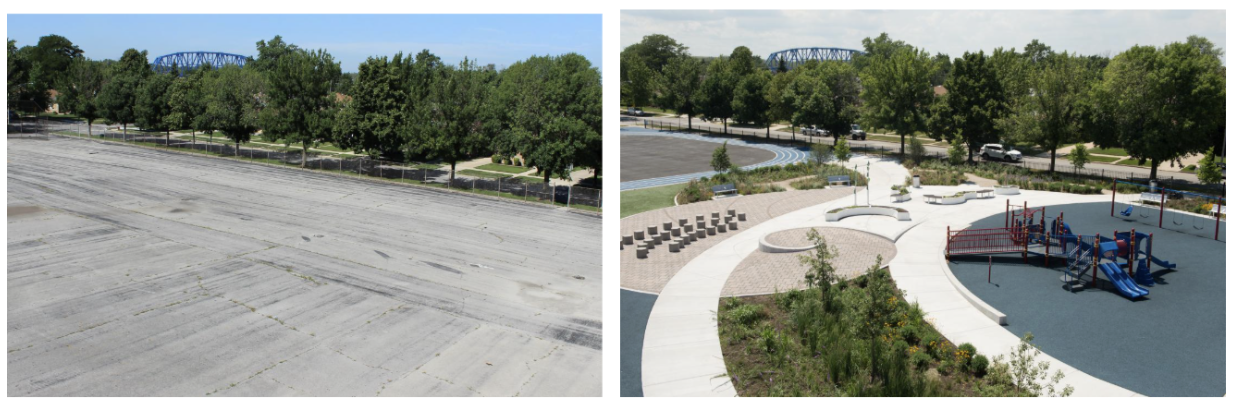The before and after of the green schoolyard project at Grissom Elementary School, which stores 253,902 gallons of stormwater. Photo courtesy of MWRD