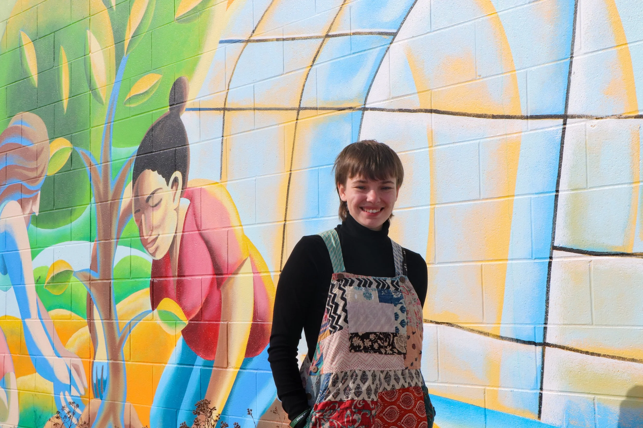 Mel Miles, MSU senior, interning for the Veggie Box Community Supported Agriculture program. The mural behind her is part of the Allen Neighborhood Center in Lansing, MI. Photo by Mia Litzenberg